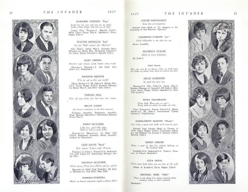 | | Pages 10 and 11 Marjorie Coffeen, Walter Henricks, Mary Hirose, Imogene Hiester, Thelma Hill, Bruce Darby, Merle Dutcher, Cleo Davis, Mozelle Dutcher, Harold Dystra, Louise Eisenhardt, Josephine Farrow, Maybelle Fuller, Billie Gardiner, Myra Gillibrand, Marguerite Hardin, Kimeo Hirose, Leta Holm, Michael Iseri