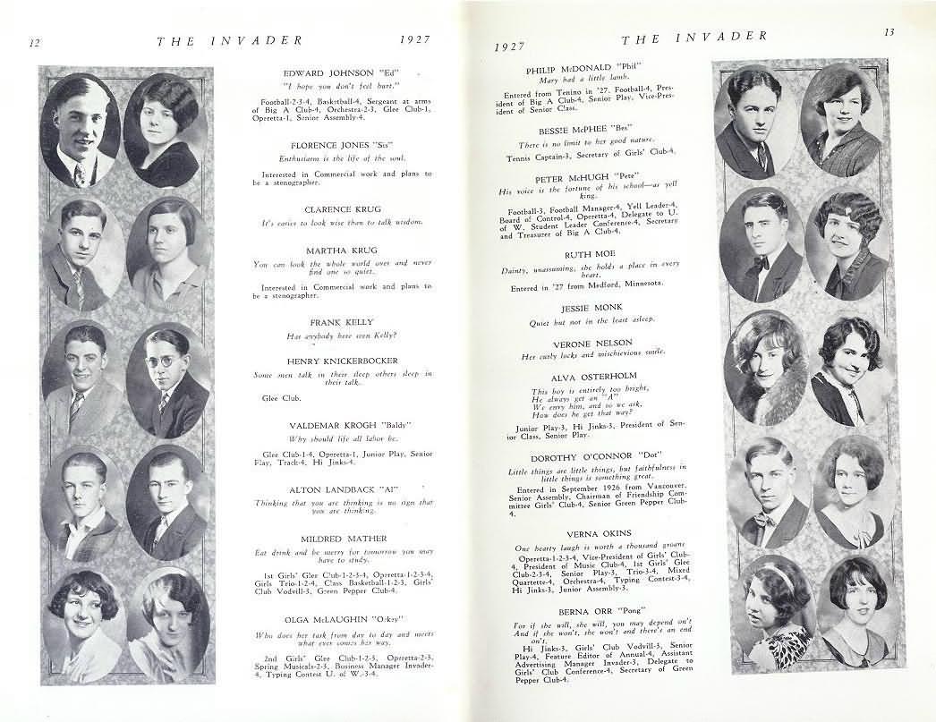 | | Pages 12 and 13 Edward Johnson, Florence Jones, Clarence Krug, Martha Krug, Frank Kelly, Henry Knickerbocker, Valdemar Krogh, Alton Landback, Mildred Mather, Olga McLaughlin, Philip McDonald, Bessie McPhee, Peter McHugh, Ruth Moe, Jessie Monk, Vernone Nelson, Alva Ostterholm, Doroth O'Conner, Verna Okins, Berna Orr