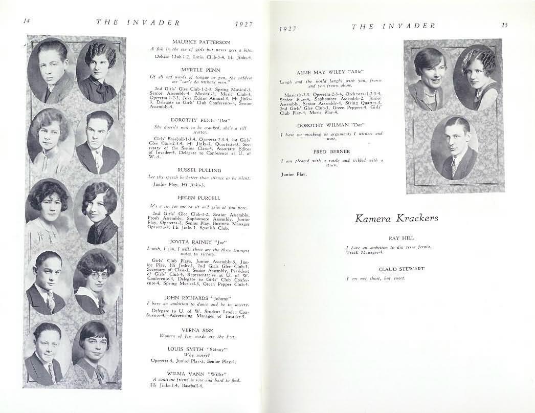 | | Pages 14 and 15 Maurice Patterson, Myrtle, Dorothy Penn, Russel Pulling, Helen Purcell, Jovita Rainey, John Richards, Verna Sisk, Louis Smith, Wilma Vann, Allie May Wiley, Dorothy Wilman, Fred Berner, Ray Hill, Claud Stewart