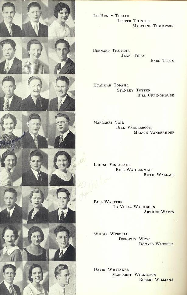 LeHenry Teller, Lester Thistle, Madeline Thompson, Bernard Thumme, Jean Tiley, Earl Titus, Hjalmar Todahl, Stanley Totten, Bill Uppinghouse, Margaret Vail, Bill Vanderboom, Melvin Vanderhoef, Louise Vistaunet, Bill Wahlenmair, Ruth Wallace, Bill Walters, La Vella Washburn, Arthur Watts, Wilma Weddell, Dorothy West, Donald Wheller, David Whitaker, Marget Wilkinson, Robert Williams, Marcella wolaver, Frank Wood, William Johnson, Verlina Campbell, Billy Carlson, Loren Durkin, Charles Hall, Louis Marshall, Herman Toms, Roy Wolfe